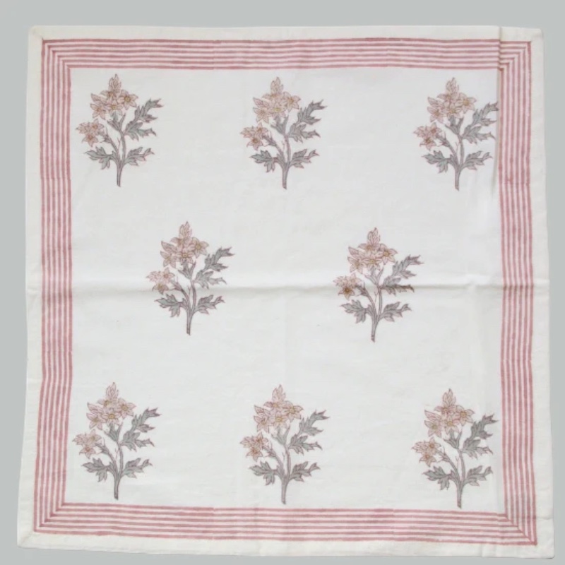 100% Faire Trade kleurige katoenen servet met een prachtig tere roze Edelweiss bloemen en bijzondere rand. Handblokprint India. Afmeting: 45×45 xm.