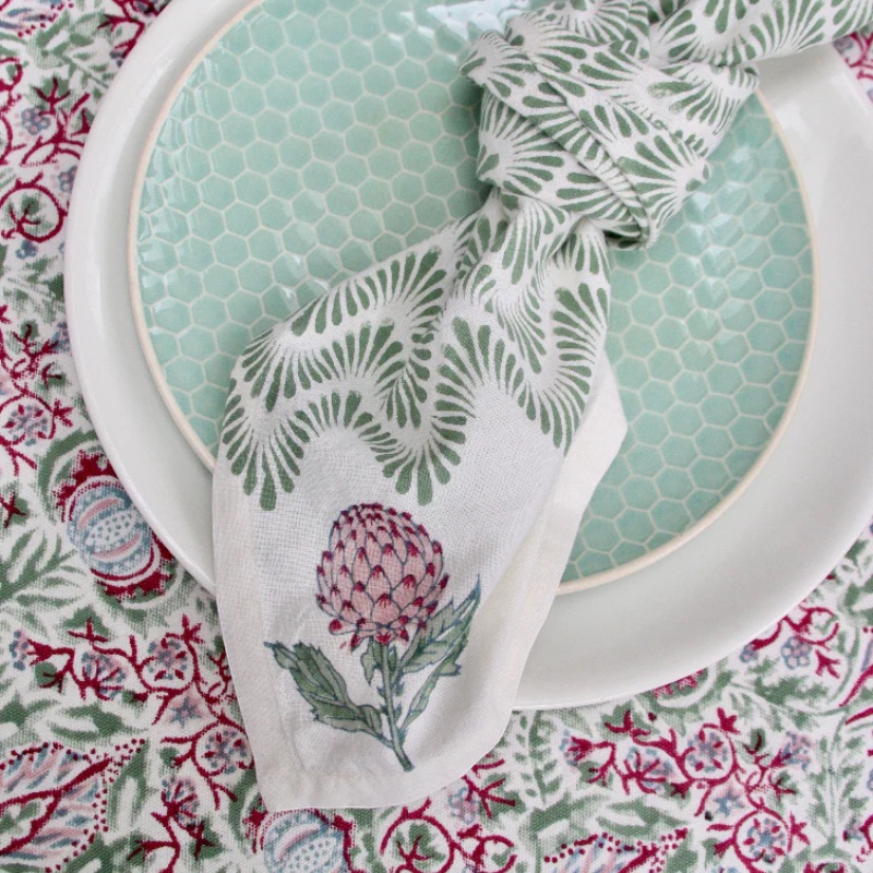 100% Faire Trade kleurige katoenen servet met een prachtige rood-roze artisjokbloem onder een brede rand van grafische groene golven. Handblokprint India. Afmeting: 45×45 xm.