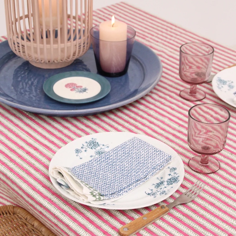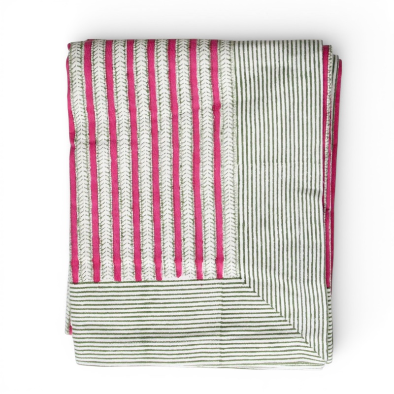 Dit prachtig bewerkte katoenen tafellaken, met een roodroze streep en een groen gestreepte rand, is met liefde en vakmanschap handgeblokprint.